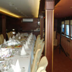 - На главной палубе расположен банкетный зал вместимостью до 35 гостей в варианте банкета и до 60 фуршетом и кают-компания. В классическом интерьере банкетного зала преобладает отделка из натурального темно-коричневого дерева. Белый потолок с многоуровневым освещением, темный ковролин, автоматические жалюзи, кондиционер.