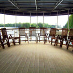 - Верхняя палуба находится под непромокаемым тентом, оборудована легкой палубной мебелью. Здесь можно организовать банкет или фуршет для небольшой компании.