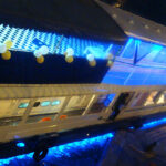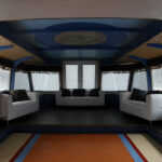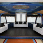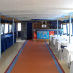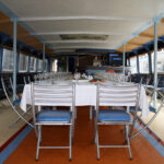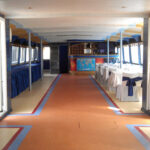 - Сочетание оттенков в интерьере нижней палубы необычно-футуристическое: белый, желтый, синий, голубой, оранжевый, песочный. Стены и потолок отделаны современными пластиковыми материалами. Панорамные окна с белыми жалюзи. Нижняя палуба разделена на несколько функциональных зон. В носовой части судна оборудована комната отдыха с мягкой мебелью и столами. Уютный банкетный зал с современной мебелью, барной стойкой, караоке, музыкальным оборудованием, гостевым холодильником может разместить до 100 гостей.