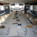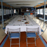 Ресторан теплохода позволяет с комфортом и удобством разместить до 70 гостей банкетом и до 100 фуршетом. Меню от шеф-повара вас приятно удивит своим разнообразием. Алкогольные и безалкогольные напитки для вашего удобства можете заказать у нас или принести с собой без пробкового сбора.