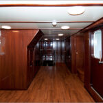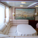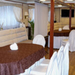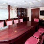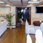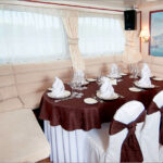 - Кают-компания яхты вмещает в себя до 20 гостей. Массивная мебель "под красное дерево": комод, стулья, овальный стол, диваны создает деловую и, в то же время, торжественную атмосферу.