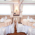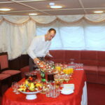 Меню от шеф-повара представлено банкетным и фуршетным вариантами. Все блюда готовятся на камбузе непосредственно перед подачей на стол командой профессиональных поваров. Широкий выбор алкогольных и безалкогольных напитков.