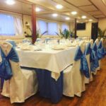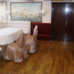 - Банкетный зал с баром позволяет комфортно разместить до 50 гостей фуршетом и 40 банкетом. Классический стиль интерьера придает помещению шикарную роскошь. Темный ламинат идеально сочетается с мягкими, полукруглыми диванами стильного кремово-бежевого цвета. Стены украшают светильники и картины с морскими пейзажами.