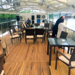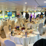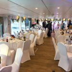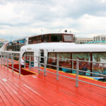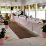 - Верхняя палуба частично находится под защитным тентом. Здесь можно устроить банкет или фуршет, накрыть приветственный стол. Открытая часть отлично подходит для дискотеки.