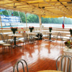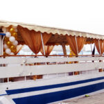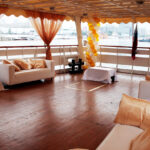 - Открытая незастекленная палуба под тентом находится на одном уровне с банкетным залом. Ротанговая мебель: диваны, кресла с придиванными столиками и мягкими подушками. По желанию клиента накрывается приветственный стол с шампанским, фруктами, канапе. Можно установить кальян, выездное караоке. Леерное ограждение по периметру палубы создает дополнительную безопасность для детей и взрослых.