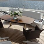 - Главная палуба разделена на несколько частей. За полупереборкой находится просторный камбуз. Здесь установлена керамическая плита, духовой шкаф, СВЧ-печь и холодильник с морозильной камерой. На палубу левого борта можно попасть через камбуз. Высокий фальшборт с тиковым широким планширем вдоль периметра, а прямо над кормовой палубой оборудован просторный флайбридж. Бортовые проходы, обширная зона под солярий с мягкими матрасами – все это обеспечит незабываемый отдых для небольшой компании. Атмосфера салона наполнена необычным уютом благодаря кожаным диванам. Вдоль борта по линии встроены шкафы, в которых вмонтированы 42-х дюймовая плазменная панель, а также стереосистема с проигрывателем и тюнером.