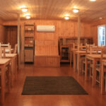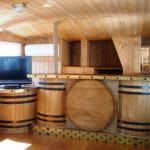 - Отличительной особенностью интерьера судна является деревянная отделка стен, потолка и пола. Создается впечатление, что вы находитесь на старинном корабле, полностью построенном из древесины. Деревянные столы и стулья, а также дизайнерский бар в виде бочек с ромом, дополняют дизайн теплохода. Нижняя палуба разделена на две зоны отдыха. Основная часть - это банкетный зал, который вмещает до 25 гостей в банкетном варианте и 30 фуршетом. Зал оснащен аудио- и видеоаппаратурой, телевизором и кондиционером. Вторая зона представляет собой небольшой салон для отдыха с мягкими диванами теплого малинового цвета.