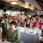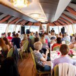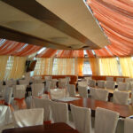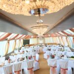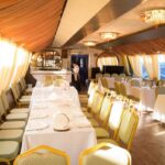 Что касается интерьеров, то здесь следует отметить гармонию цвета и стиля. Банкетный зал декорирован натуральным деревом, двухцветными полупрозрачными портьерами и представляет собой единое пространство, позволяющее планировать различную расстановку столов в соответствии с количеством гостей и программой мероприятия. После реконструкции, которая завершилась в 2017 году теплоход обзавелся сценой и верхней смотровой площадкой, надстроенной в кормовой части. Более подробно осмотреть интерьеры теплохода «Гнездо Глухаря» можно на фото.