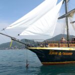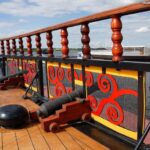 - Интерьер яхты выполнен в едином «пиратском» стиле: "настоящие" паруса, веревочные лестницы, капитанский мостик. По периметру палубы расположены пушки, из которых можно пострелять. В кормовой части судна – банкетный зал с выходом на открытую палубу.