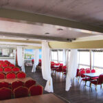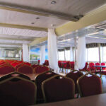 - На главной палубе теплохода «Колёсовъ» расположен просторный банкетный зал с панорамным остеклением и современным дизайном. Здесь комфортно размещается до 150 гостей банкетом и до 250 фуршетом. Стильный интерьер выполнен в нежно-бежевых тонах, что оптимально подходит для проведения мероприятия любого формата: от корпоратива до свадьбы. Есть барная стойка. Из банкетного зала – выход в кормовую часть. Здесь можно увидеть лопастные колеса за счет которых осуществляется ход теплохода.