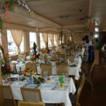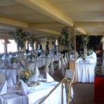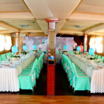 - На нижней палубе закрытый банкетный зал, дизайн которого выполнен в классическом стиле. Вход визуально разделяет зал на две части, в одной круглые столы евро рассадкой, в другой прямоугольные, расставленные по центру и по бокам зала. Изящные, металлические стулья с мягкими сиденьями. Ламинат темного цвета удачно сочетается с оттенками стен и потолка. Строгие колонны с вставками из зеркал зрительно расширяют и без того просторное помещение. На стенах оригинальные постеры и светильники, которые создают атмосферу уюта и гармонии. Есть небольшая барная зона. Для диджея отведено отдельное пространство между залом и кают-компанией.