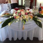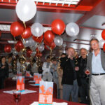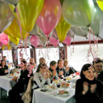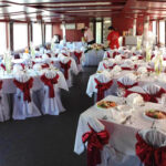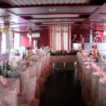 - На главной палубе теплохода расположен банкетный зал, который способен принимать до 100 гостей фуршетом и до 80 при банкетной рассадке. Интерьер зала выполнен в теплых малиновых тонах с оригинальными резными вставками на стенах и стильными зеркальными опорами. Есть бар, телевизор, музыкальный центр.
