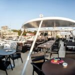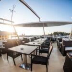 - Верхняя палуба частично находится под тентом. Здесь есть ротанговая мебель и шезлонги. Отлично подходит для организации дискотеки, вечеринки или фуршета на 50 гостей.
