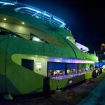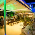 - Обстановка зала на средней палубе выполнена в стиле хай-тек. Зал предназначен для проведения дискотек, приватных вечеринок, организации приветственной зоны. Стильная мебель органично вписывается в интерьер. Есть барная стойка, которая при непогоде закрывается раздвижными стеклами. Здесь можно установить стол для проведения деловых встреч и переговоров.