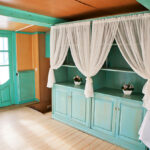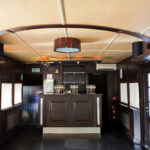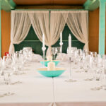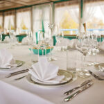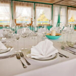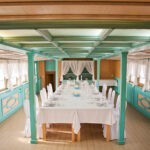 - Банкетный зал находится по центру палубы и вмещает до 50 гостей в варианте банкета и до 100 в режиме праздничного фуршета. Интерьер довольно необычный: мебель с эффектом "состаривания", салатово-коричневые оттенки стен и пола. В банкетном зале имеется кондиционер, а также установлены ЖК-панели и музыкальная аппаратура. Окна закрываются плотными шторами.