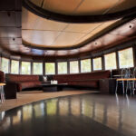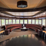 - В носовой части теплохода "Петрович" - музыкальный салон. Он представляет собой уютную комнату в виде полусферы с шикарным, мягким диваном необычной расцветки. Интерьер выполнен в оттенках темного шоколада с бежевыми элементами. В помещении установлены тумбочки, столик, стулья. Есть барная стойка, аудиотехника, караоке.