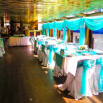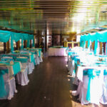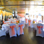 - Нижняя закрытая палуба площадью 90 кв. м. с панорамным остеклением, представляет собой основной банкетный зал, где можно с комфортом разместить 70-80 гостей в банкетной рассадке и до 110 фуршетом