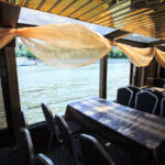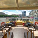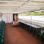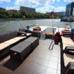 - Верхняя палуба условно разделена на 2 части. Одна находится под прозрачным непромокаемым тентом и оборудована палубной мебелью (столы, стулья). Кормовая часть палубы - открытая смотровая площадка, по периметру которой располагается плетеная мебель из ротанга с мягкими подушками. Разрешается данную зону использовать под кальян