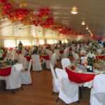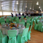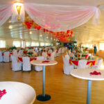 - Просторный и вместительный банкетный площадью больше 600 кв. м. с функциональной мебелью, которая расставляется с учетом пожеланий клиента. Светло-ореховый ламинат, стены цвета карамели, большие панорамные окна с легкими занавесками, полукруглый потолок - единое гармоничное пространство, которое дарит ощущение комфорта. В зале оборудована зона для выступления артистов и презентаций. Есть «гримерки», барная зона. Банкетный зал имеет три выхода в различных частях корабля, что значительно облегчает перемещение по судну.