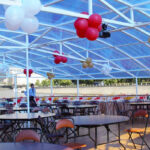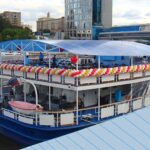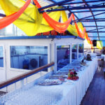 - Верхняя палуба разделена на две части. Открытая – предназначена для прогулок на свежем воздухе, дискотек, запуска фейерверков. Вторая зона на верхней палубе расположена в кормовой части и закрыта тентом. Площадка оборудована удобной мебелью для фуршетов и банкетов. Установлена соответствующая аппаратура для проведения концертов и выступления артистов.