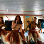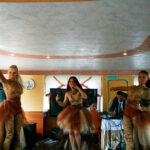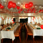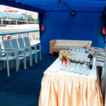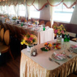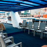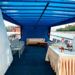 - Верхняя палуба условно разделена на две части. Одна часть с неброской мебелью находится под непромокаемым тентом. По желанию клиента можно установить приветственный стол, задрапировать борта тканью, сделать шторки. Другая часть верхней палубы представляет собой открытую смотровую площадку. Разрешается данную зону использовать под кальян, танцпол, установку шезлонгов.