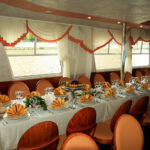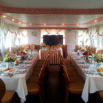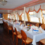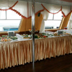 - Главный банкетный зал расположен на нижней палубе. Максимальная вместимость гостей - 55 (фуршет и банкет). Классическое сочетание бежево-коричневых тонов в интерьере, мягкая мебель, большие панорамные окна, шикарные шторы - все это создает благородную аристократическую атмосферу и хорошо подходит к любому формату мероприятий.