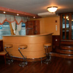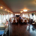 Бар-ресторан позволяет разместить до 55 персон. Камбуз теплохода оборудован холодильниками, морозильными камерами, плитой с духовым шкафом, что позволяет обеспечить длительное качественное хранение любых продуктов. Это особенно важно для проведения пикников на теплоходе и выездных мероприятий. Меню представлено банкетным, фуршетным вариантами и специальным меню для пикников. Алкоголь и безалкогольные напитки для вашего удобства можете заказать у нас или принести с собой без пробкового сбора.