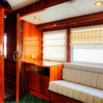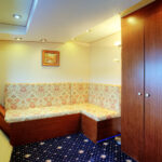 - В носовой части главной палубы находится уютная и вместительная кают- компания, оборудованная телевизором, музыкальным центром, караоке, кондиционером. По периметру помещения установлены мягкие модульные диваны. Здесь можно провести конфиденциальные переговоры, уединиться с друзьями и родными или устроить караоке-вечеринку.