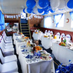 - Банкетный зал расположен на главной палубе и вмещает банкетом – до 30 гостей, фуршетом – до 40 гостей. Интерьер зала выполнен в приятных, теплых тонах: стены цвета молочного шоколада, легкие занавески на окнах, светлый потолок, темно-синий ковролин. Помещение оборудовано системой климат-контроль, музыкальным центром. В зале есть небольшая барная стойка.