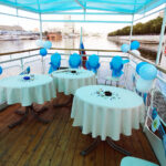- На верхней палубе расположены две площадки. Одна из которых находится в носовой части корабля - полностью открытая. Вы с удовольствием сможете наблюдать за пейзажами и одновременно принимать солнечные ванны. Другая площадка закрыта непромокаемым тентом. Пространство верхней палубы с удобной, легкой мебелью позволяет организовать вечеринку, корпоративный фуршет или дискотеку. По вашему желанию можно установить дополнительное оборудование.