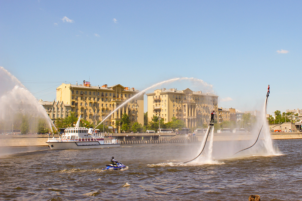 Привлекло внимание зрителей выступление флайбордистов, которые выполняли различные акробатические трюки на высоте около 10 метров над водой.