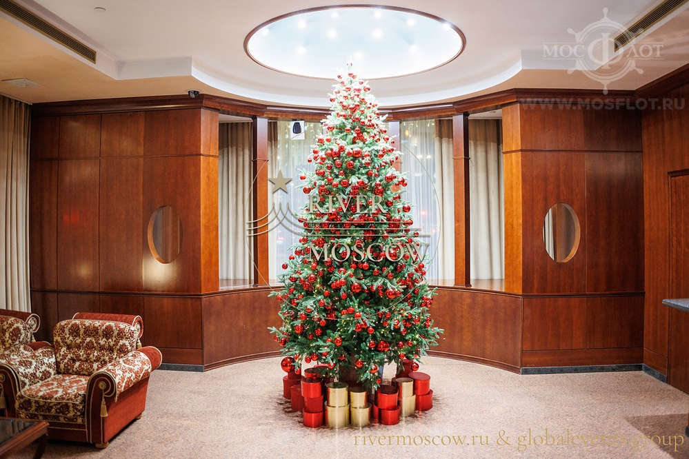 Банкетный зал в стиле русского неоклассицизма поражает своим великолепием: изящные лепные украшения, сияющие хрустальные люстры, благородный мрамор и торжественная парадная лестница, ведущая к фонтану. Каждая деталь интерьера создает неповторимую атмосферу праздника и роскоши, идеально подходящую для встречи Нового года.