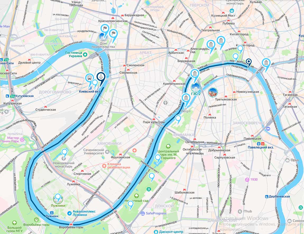 От причала Киевский до Парка Зарядье (1,15 час)Киевский вокзал → Парк Горького → Крымский мост → Храм Христа Спасителя → Зарядье | От парка Зарядье до Киевского вокзала (1,5 часа)Устьинский мост → Зарядье → Большой Каменный мост → Воробьевы горы → Лужники → Киевский вокзал |